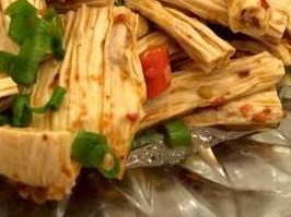 腐竹制作工藝比較簡單,將大豆磨成豆漿,將豆漿放入腐竹機加熱煮熟冷卻后,就會在豆漿面上形成了一層膜(軟皮),將其揭起卷成長桿狀,干燥后,外觀有些像竹子,所以稱為腐竹,它還有支竹、豆腐皮、豆棒、豆筋棍、豆精等別稱。