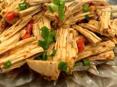 材 料:腐竹100克,黃瓜半根,蔥、花椒、熟黑芝麻、生抽、香醋、鹽、香油適量